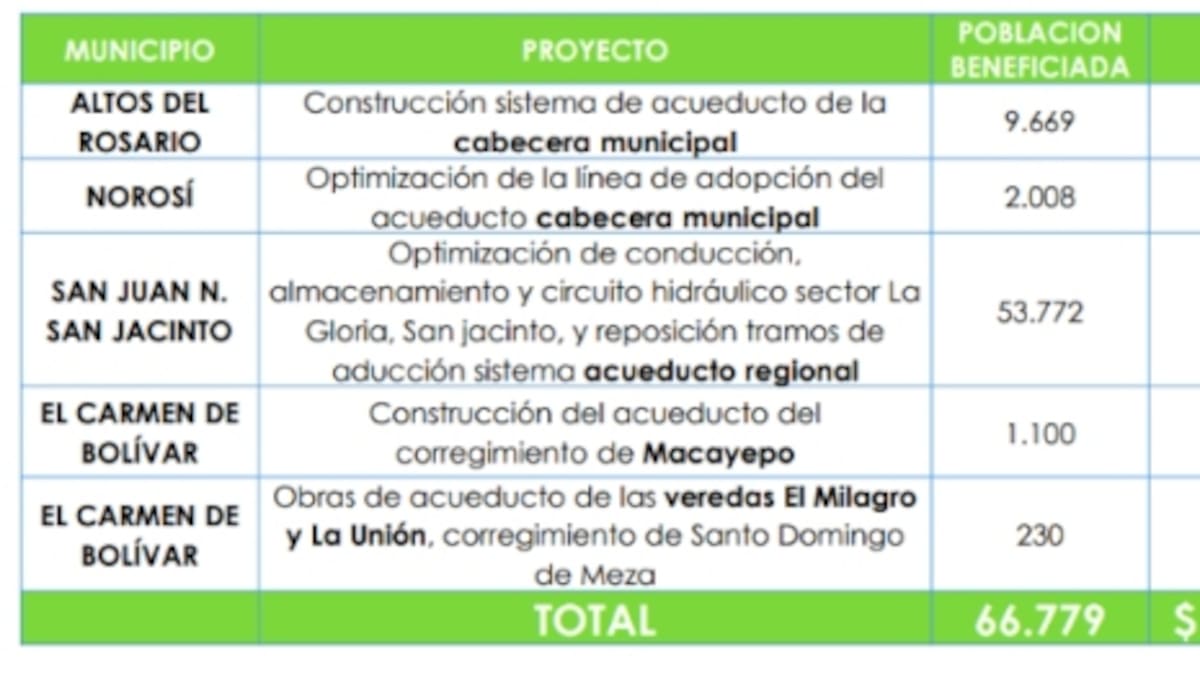 El proyecto beneficiaría a un total de 66.779 habitantes con la construcción del sistema de acueducto en Altos del Rosario, con una inversión de $8.215.278.434,02, y la optimización de la línea de adopción del acueducto en la cabecera municipal de Norosí, con un valor de $10.934.683.226,00. Además, en San Juan Nepomuceno y San Jacinto se llevarán a cabo obras de optimización de conducción, almacenamiento y circuito hidráulico en el sector La Gloria, así como la reposición de tramos de aducción del sistema acueducto regional, con una inversión de $20.217.905.567.
